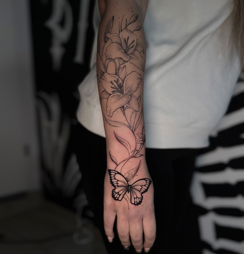 Erlebe die zeitlose Eleganz der Black & Grey Tattoos. Mit nur schwarzen Tinten und Schattierungen schaffen unsere Künstler beeindruckende und detaillierte Kunstwerke, die durch ihre Tiefe und Kontraste bestechen.